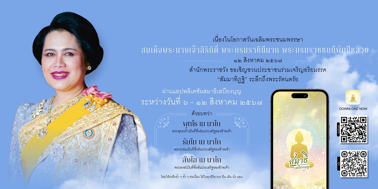 สำนักพระราชวัง ขอเชิญชวนประชาชนร่วมเจริญอริยมรรค “สัมมาทิฏฐิ” ระลึกถึงพระรัตนตรัย ว่าเป็นสรณะที่พึ่งที่ยึดถือ อันเป็นทางเป็นธรรมที่พระพุทธองค์ได้ตรัสไว้โดยชอบ เพื่อถวายเป็นพระราชกุศล แด่สมเด็จพระนางเจ้าสิริกิติ์ พระบรมราชินีนาถ พระบรมราชชนนีพันปีหลวง เนื่องในโอกาสวันเฉลิมพระชนมพรรษา ๑๒ สิงหาคม ๒๕๖๗ ผ่านแอปพลิเคชัน “สมาธิเสบียงบุญ”