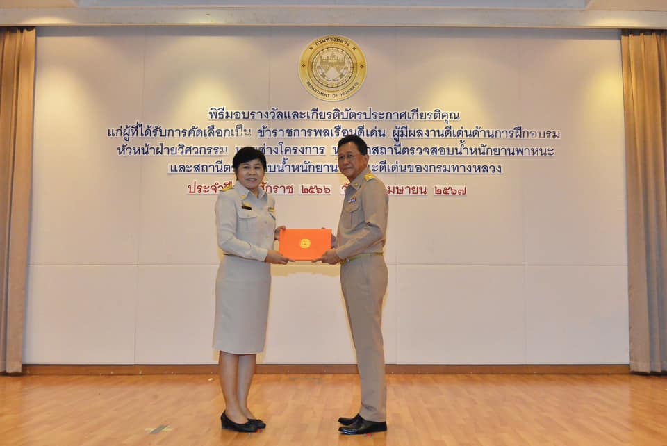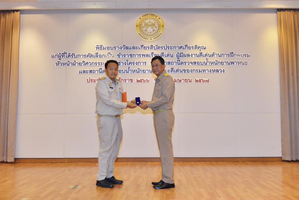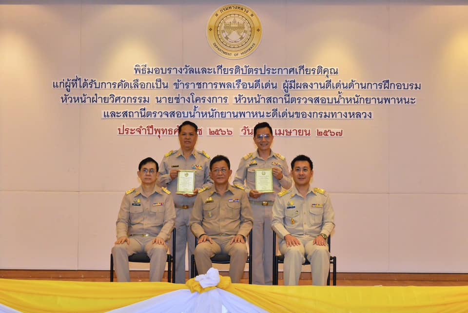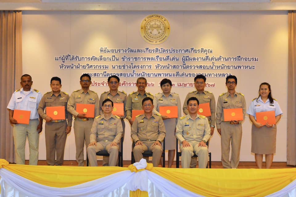 วันนี้ (3 เมษายน 2567) เวลา 10.30 น. นายสราวุธ ทรงศิวิไล อธิบดีกรมทางหลวง เป็นประธานพิธีมอบรางวัลและเกียรติบัตรประกาศเกียรติคุณแก่ผู้ที่ได้รับการคัดเลือกเป็นข้าราชการพลเรือนดีเด่น เนื่องในโอกาสวันคล้ายวันสถาปนากรมทางหลวง ปีที่ 112 ผู้มีผลงานดีเด่นด้านการฝึกอบรม นายช่างโครงการ หัวหน้าสถานีตรวจสอบน้ำหนักยานพาหนะ และสถานีตรวจสอบน้ำหนักยานพาหนะดีเด่นของกรมทางหลวง ประจำปี พ.ศ. 2566 จำนวน 31 คน ณ ห้องสัมมนาเทิดศักดิ์ เศรษฐมานพ กองฝึกอบรม