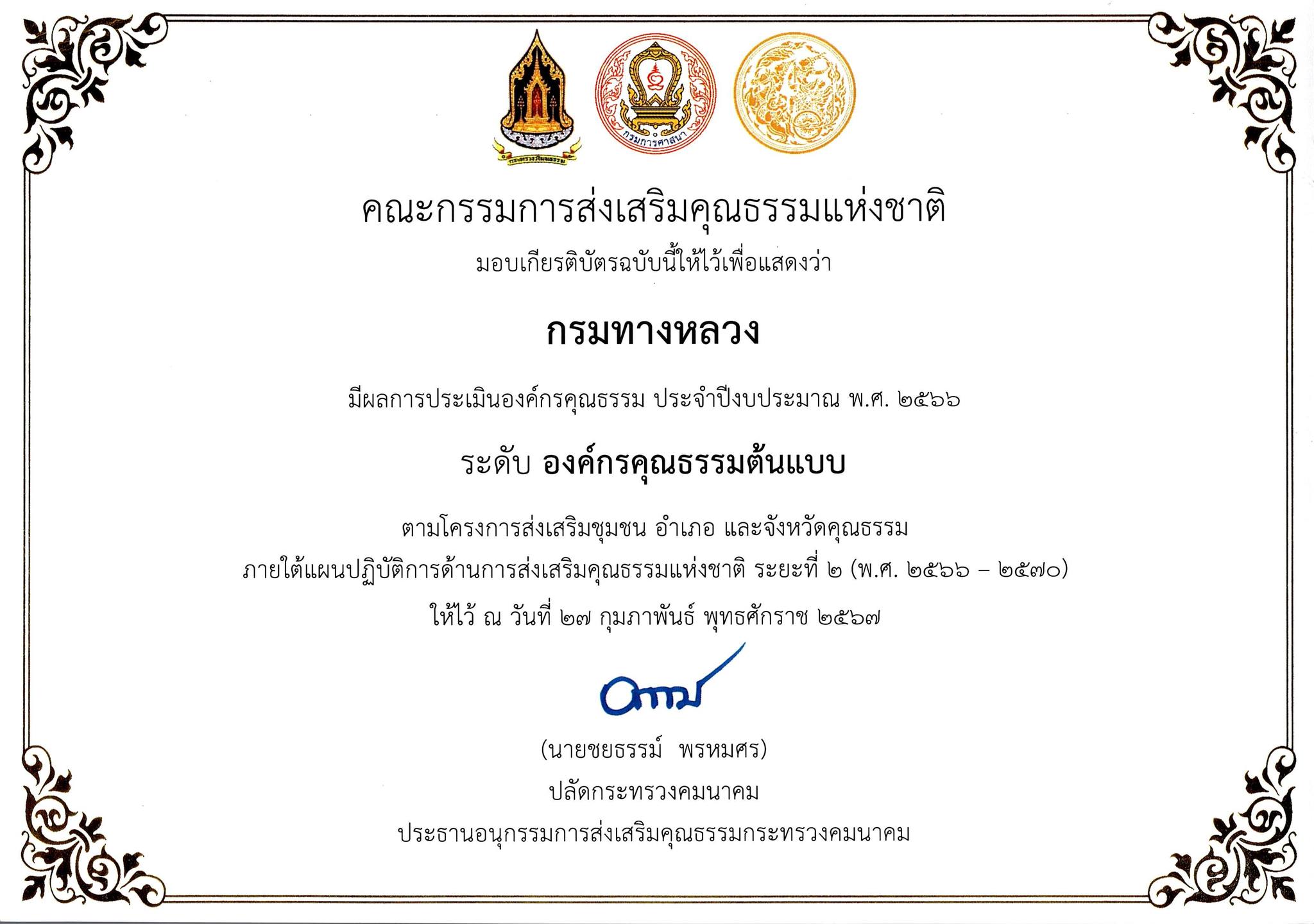 แขวงทางหลวงตราด ขอแสดงความยินดีแก่ผู้ที่ได้รับคัดเลือกข้าราชการดีเด่นของกรมทางหลวง ประจำปี พ.ศ. 2566 จำนวน 31 คน และขอยกย่องเชิดชูกรมทางหลวงที่ได้รับการประเมินจากคณะกรรมการส่งเสริมคุณธรรมแห่งชาติ ในระดับ องค์กรคุณธรรมต้นแบบ
